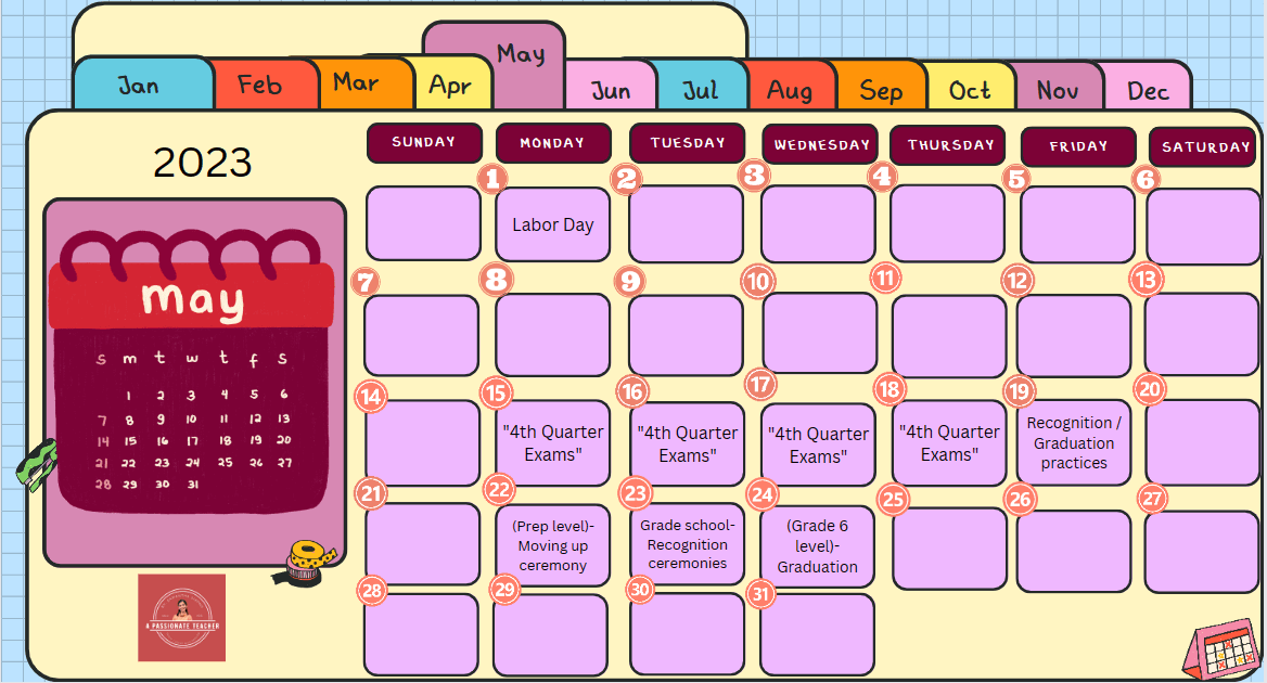 This customizable and printable school calendar for academic year (2023-2024) is a file that I create for you to take note of the following dates of “School events” in each month.