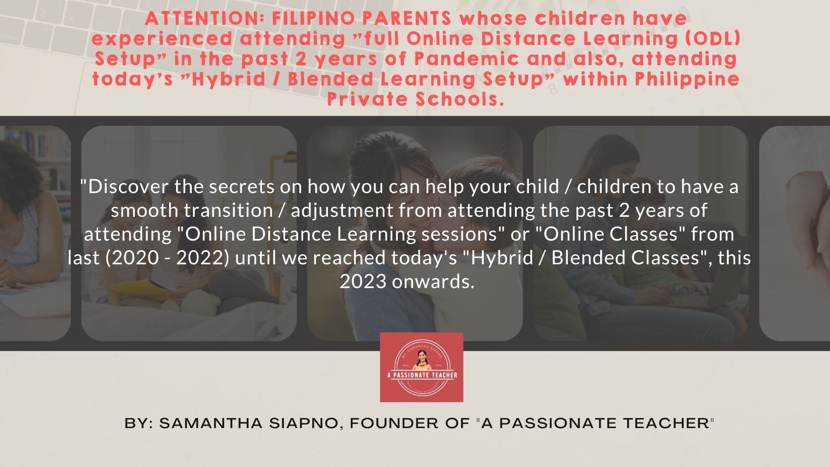 The purpose of this E-book is to help you, Dear Parents, to have a “hassle free” of transitioning / moving to from being in a “nervous state of mind” when you assist or guide your children in the past 2 years of “Online Distance Learning Setup”, turning into a more “confident and calm state of mind” in guiding your children and their progress, until this present year of the “Hybrid / Blended Learning Setup” this School Year 2023 – 2024 onwards.
